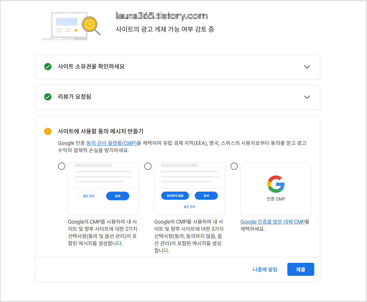 • myblog.tistory.com 도 사용 가능하지만, 개인 도메인 연결 시 신뢰도와 승인 확률 상승