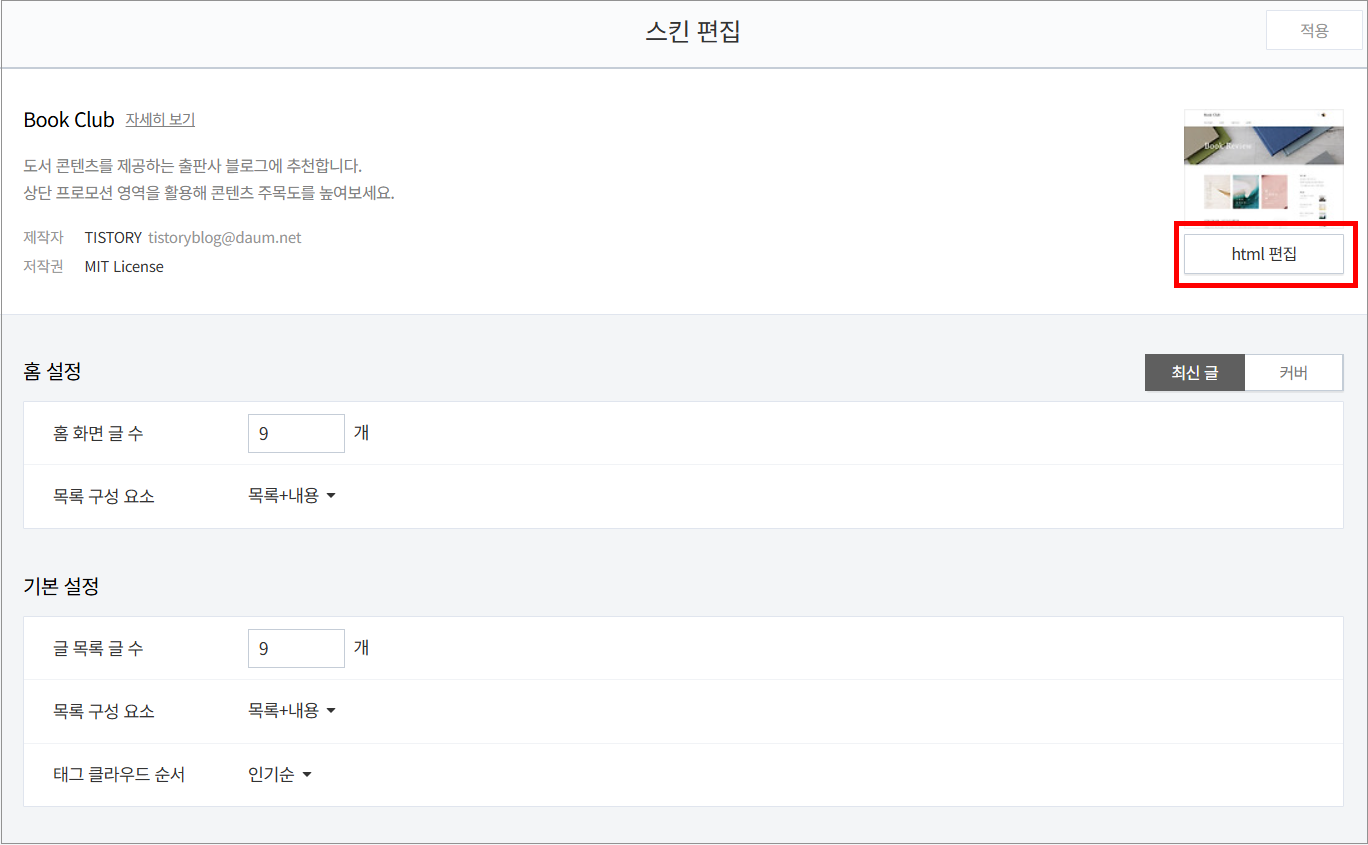 2. 티스토리 관리자 → 꾸미기 → HTML 편집