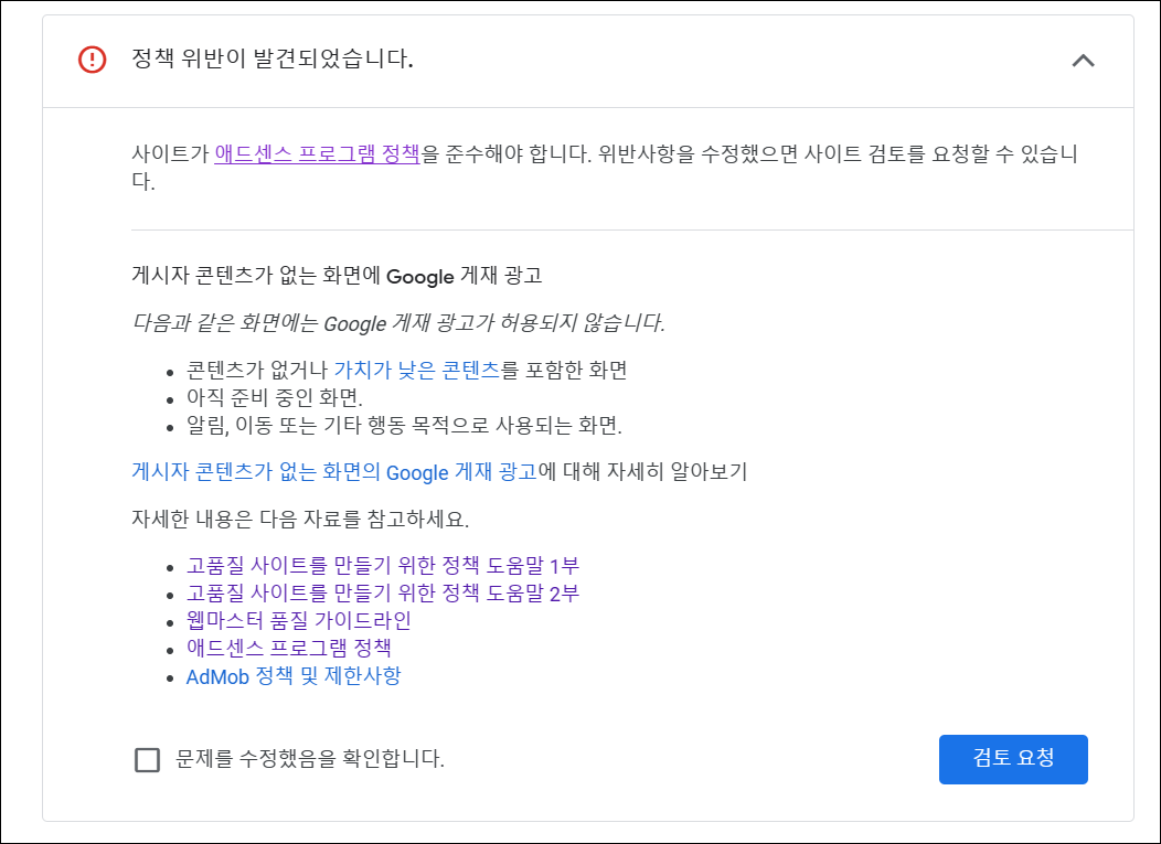심지어 무슨 정책위반이라니? 알고 보니 글이 부족해서 거절된 경우였습니다.