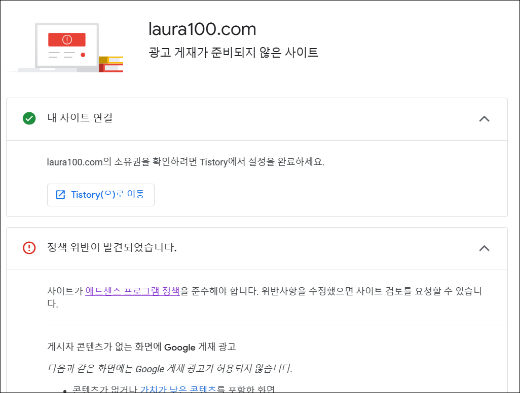 글 좀 덜 썼다고 광고 게재가 준비되지 않은 사이트라고 왔네요.