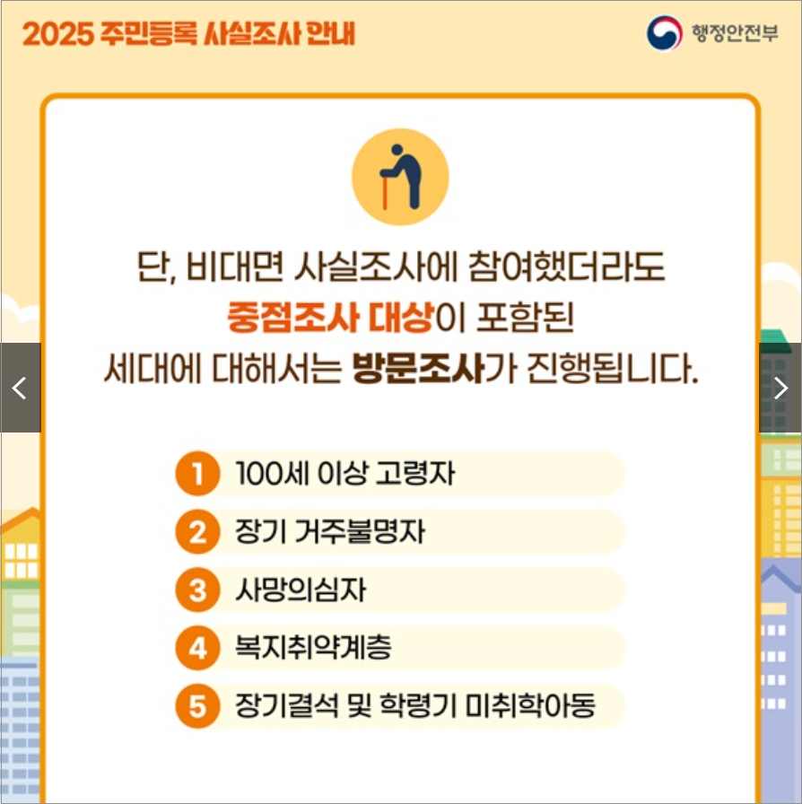 - 2025 주민등록 사실조사 기간 : 비대면(7.218.31) → 방문(9.110.23)